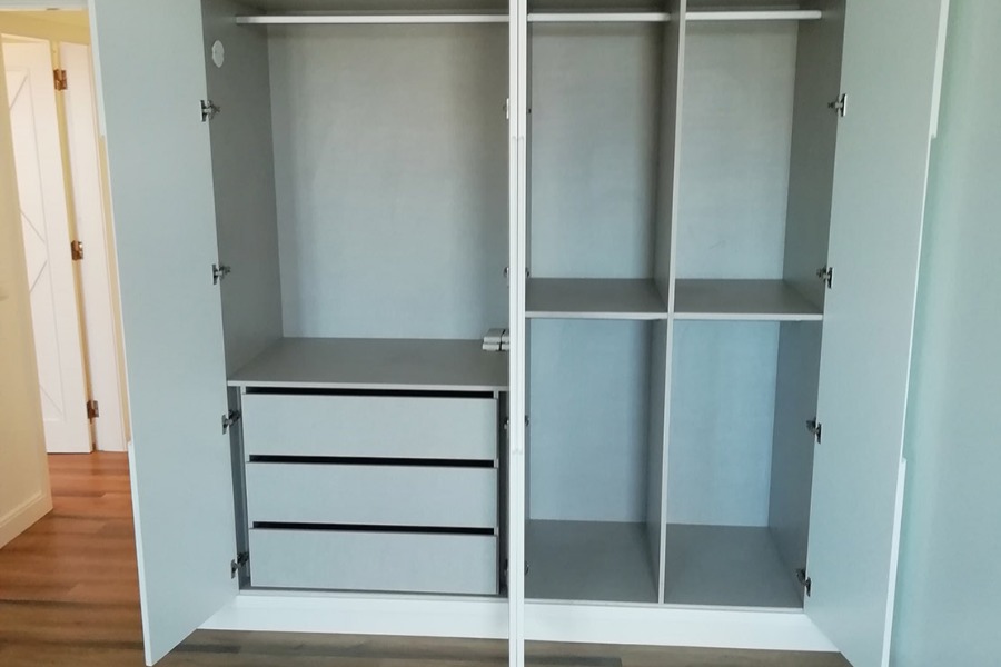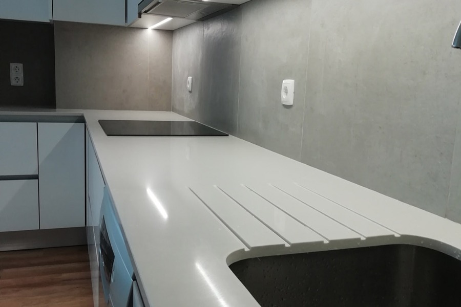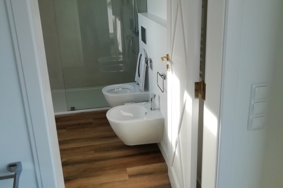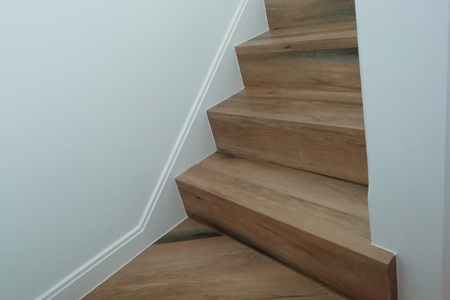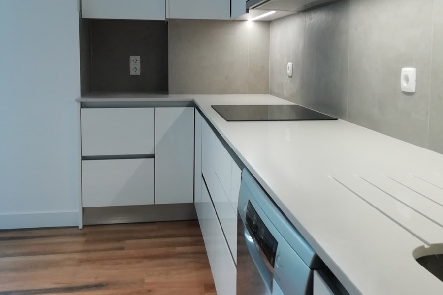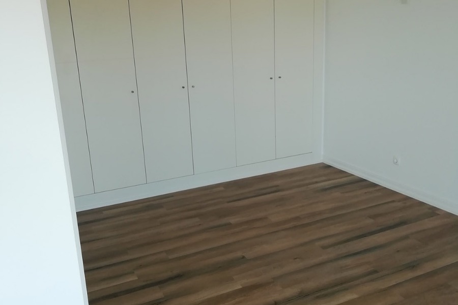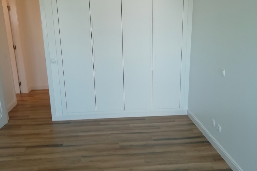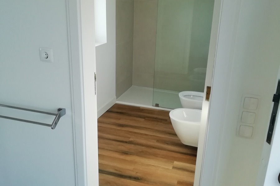 Apartamento Cascais. Pavimento Dk-Flooring ® - dk 921 Savannah com solução de perfil de escada direito. // Cozinha termo laminado branco brilho com puxador perfil gola cor anodizado, iluminação em fita de led, roupeiros acabamento MDF Lacado Branco Mate, iluminação led em mobiliário superior.