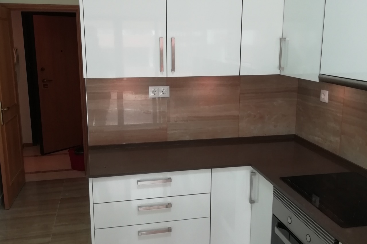 Mobiliário de cozinha termolaminado em branco brilho com puxadores "gola".